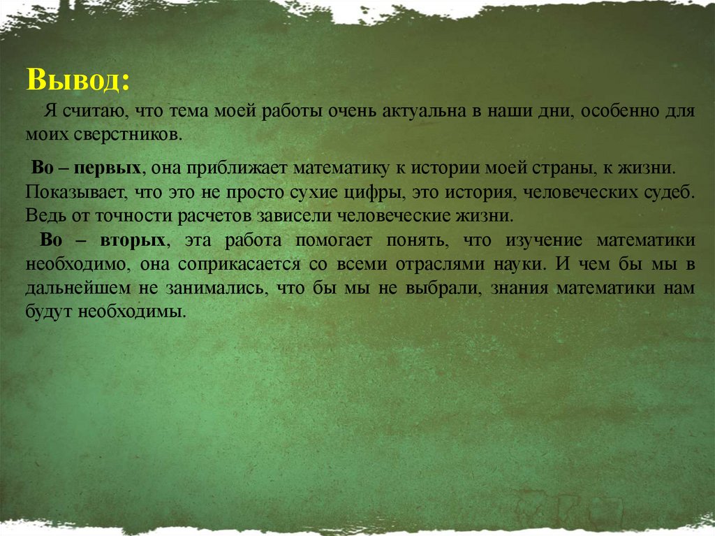 Во – первых, она приближает математику к истории моей страны, к жизни.