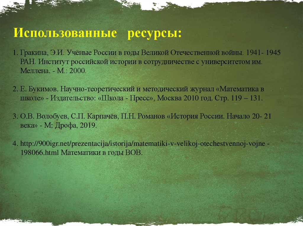 Использованные ресурсы:1. Гракина, Э.И. Учёные России в годы Великой Отечественной войны. 1941- 1945