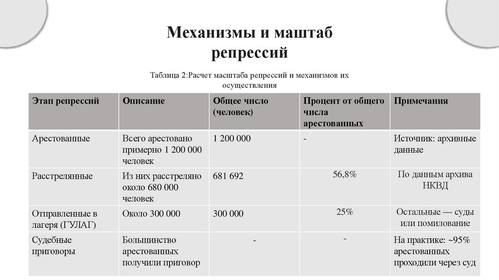 Таблица 2:Расчет масштаба репрессий и механизмов их