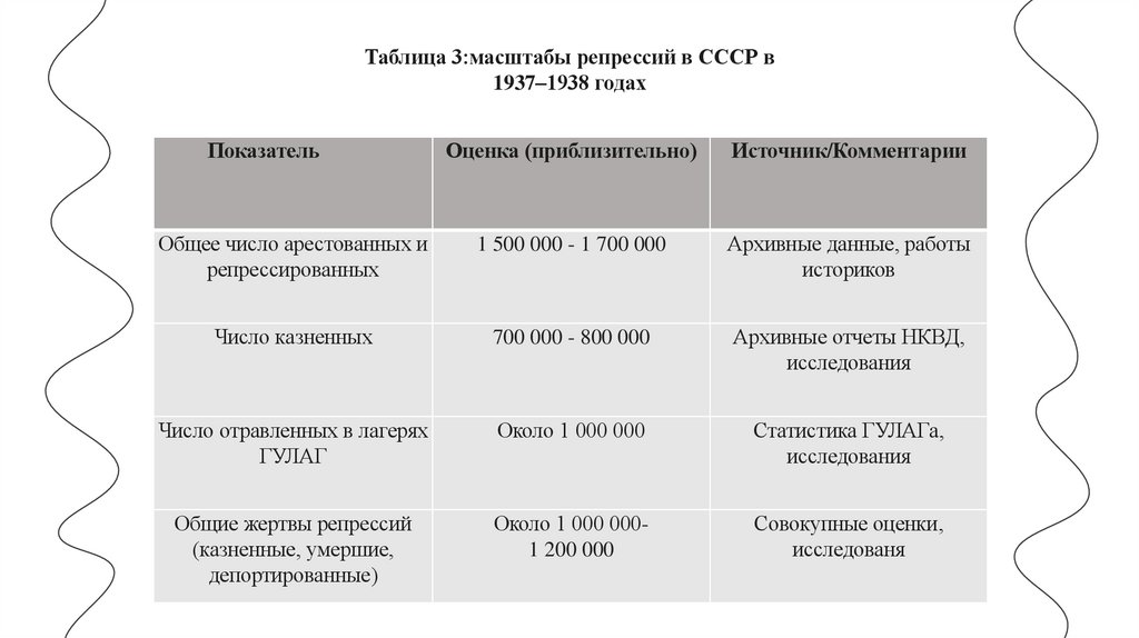 Таблица 3:масштабы репрессий в СССР в1937–1938 годах