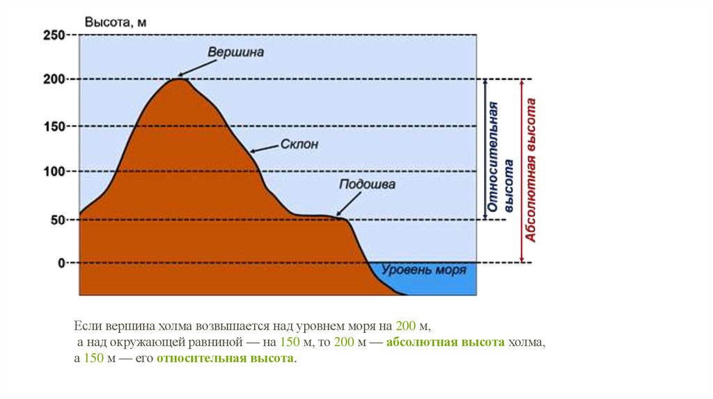 Если вершина холма возвышается над уровнем моря на 200 м,а над окружающей равниной — на 150 м, то 200 м — абсолютная высота холма,