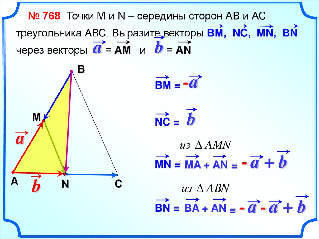 № 768 Точки М и N – середины сторон АВ и АСтреугольника АВС. Выразите векторы ВМ, NC, MN, BN