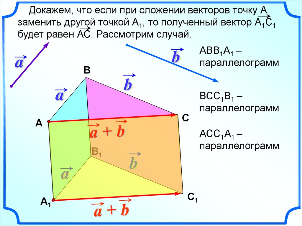 Докажем, что если при сложении векторов точку Азаменить другой точкой А1, то полученный вектор А1С1