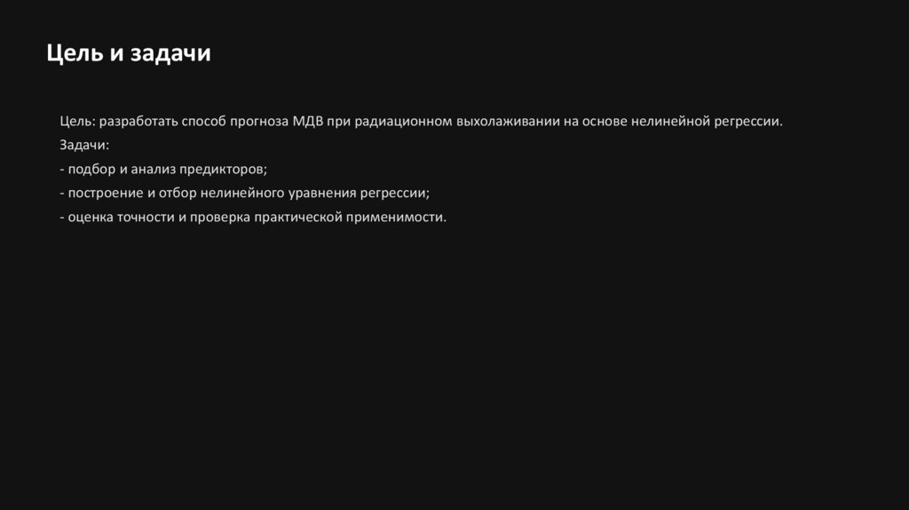 Цель и задачиЦель: разработать способ прогноза МДВ при радиационном выхолаживании на основе нелинейной регрессии.