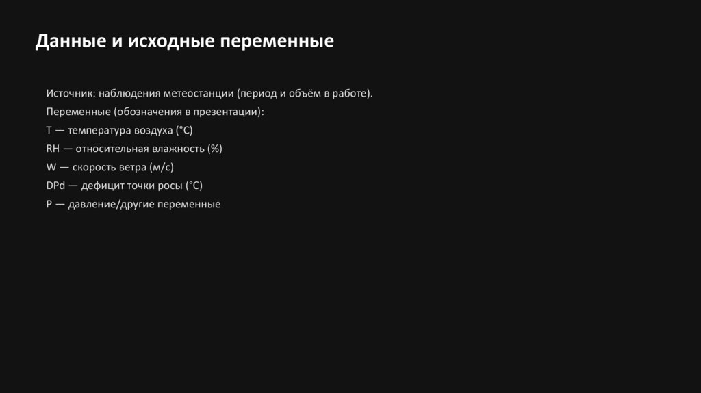 Данные и исходные переменныеИсточник: наблюдения метеостанции (период и объём в работе).