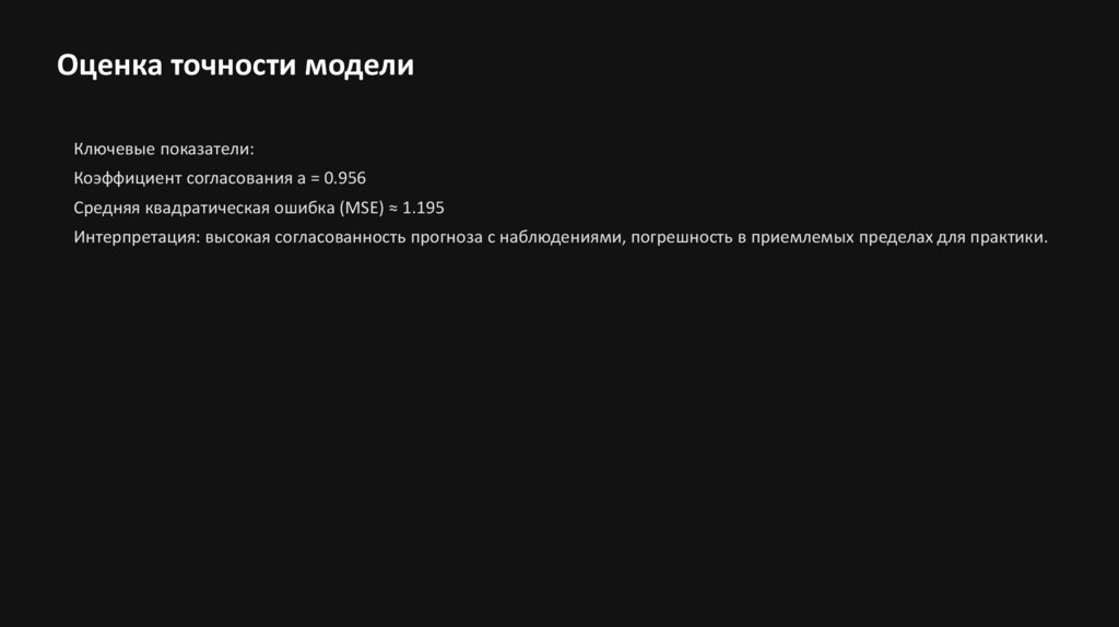 Интерпретация: высокая согласованность прогноза с наблюдениями, погрешность в приемлемых пределах для практики.
