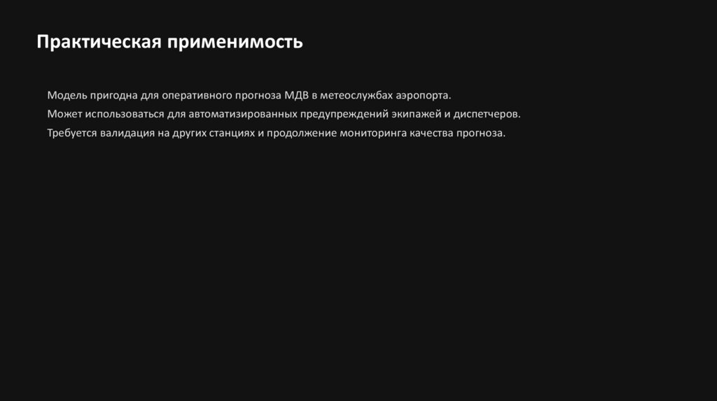 Практическая применимостьМодель пригодна для оперативного прогноза МДВ в метеослужбах аэропорта.