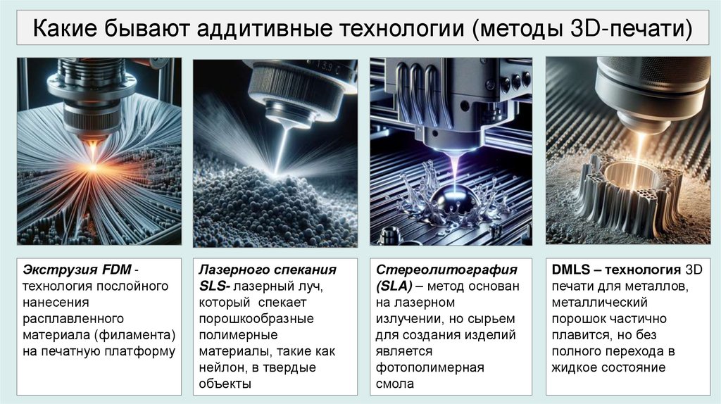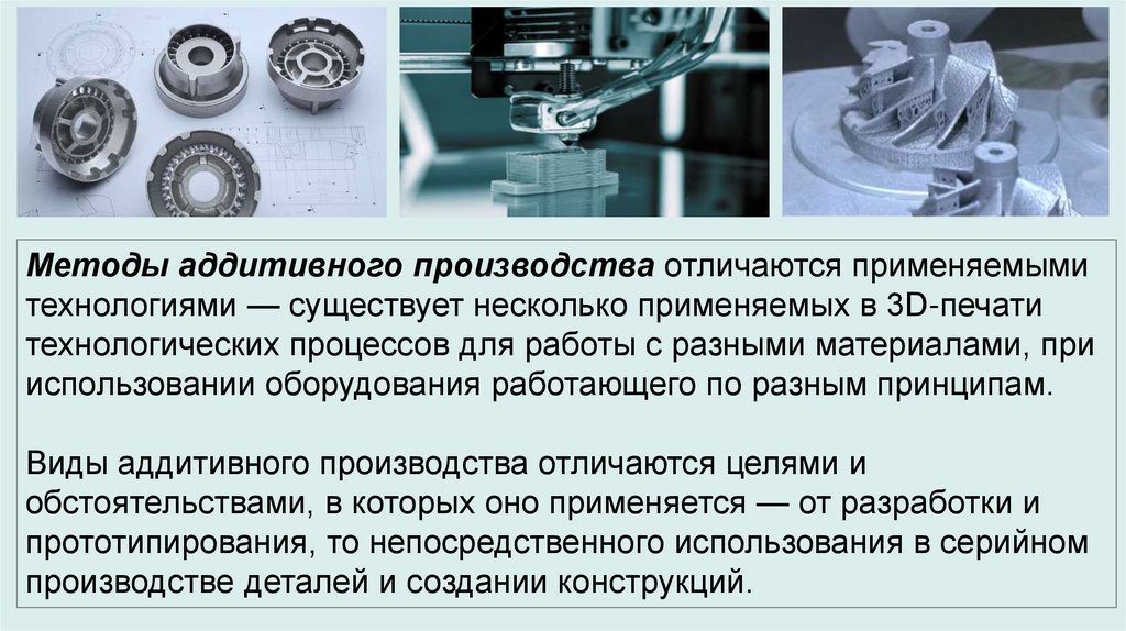 Методы аддитивного производства отличаются применяемымитехнологиями — существует несколько применяемых в 3D-печати