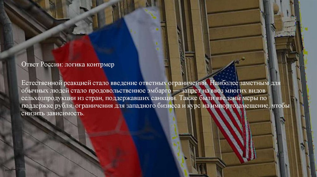 Ответ России: логика контрмерЕстественной реакцией стало введение ответных ограничений. Наиболее заметным для
