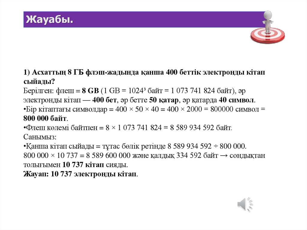 Жауабы.1) Асхаттың 8 ГБ флэш-жадында қанша 400 беттік электронды кітап