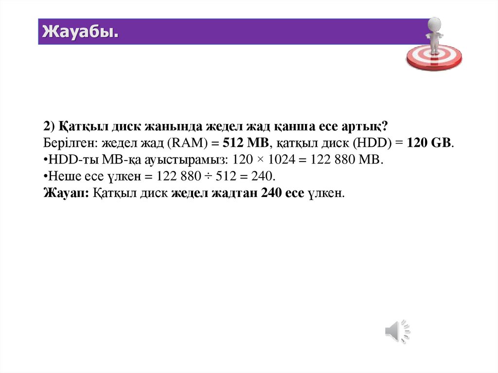 •HDD-ты MB-қа ауыстырамыз: 120 × 1024 = 122 880 MB.