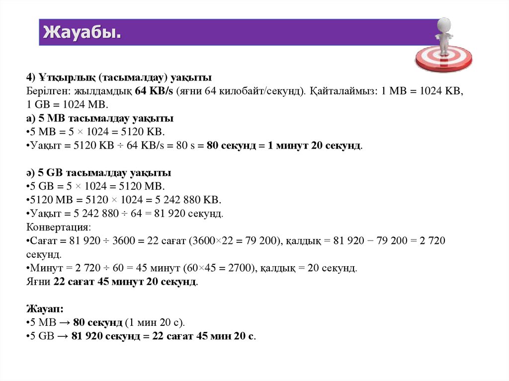 •Уақыт = 5120 KB ÷ 64 KB/s = 80 s = 80 секунд = 1 минут 20 секунд.