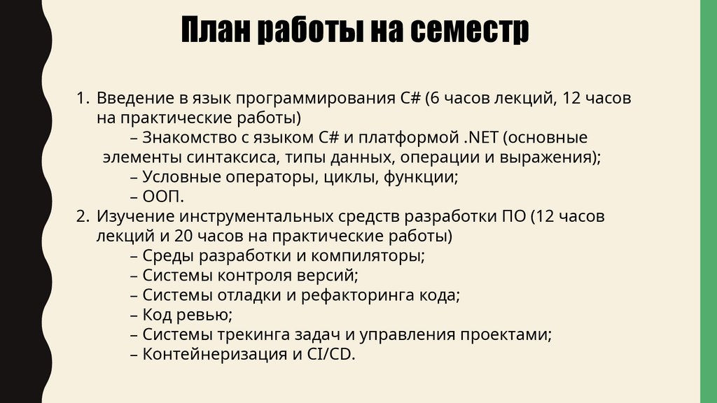 План работы на семестр1. Введение в язык программирования C# (6 часов лекций, 12 часов