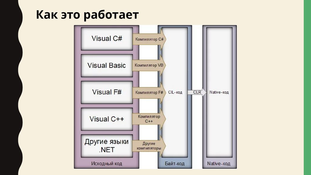 не в нативный код (исполняемый), а в промежуточный байт-код CIL (англ.