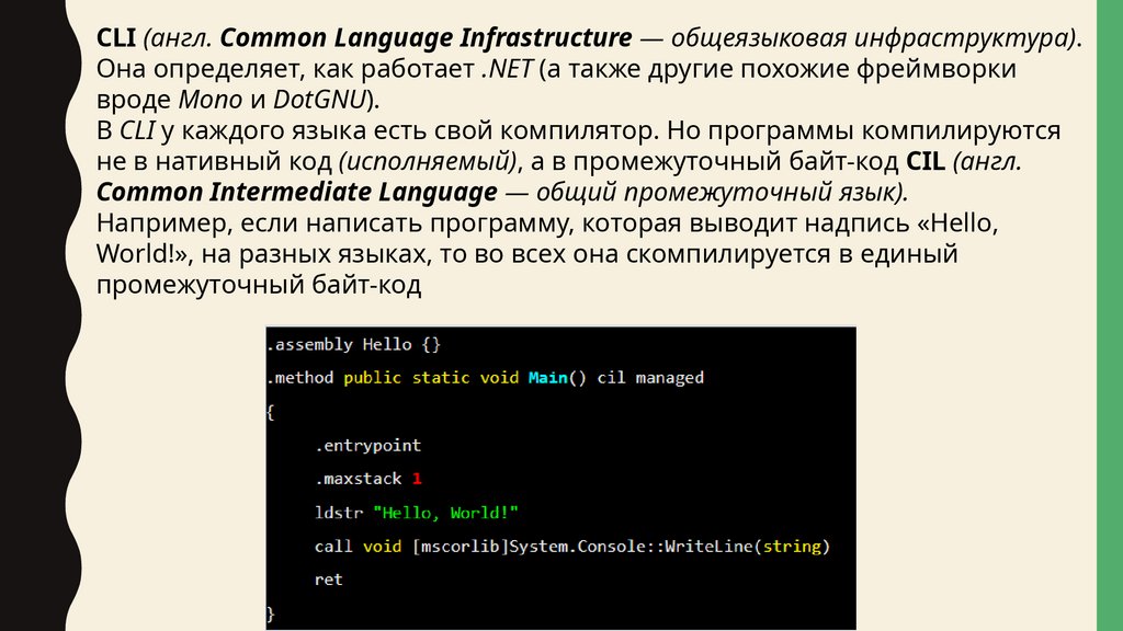 CLI (англ. Common Language Infrastructure — общеязыковая инфраструктура).Она определяет, как работает .NET (а также другие похожие фреймворки