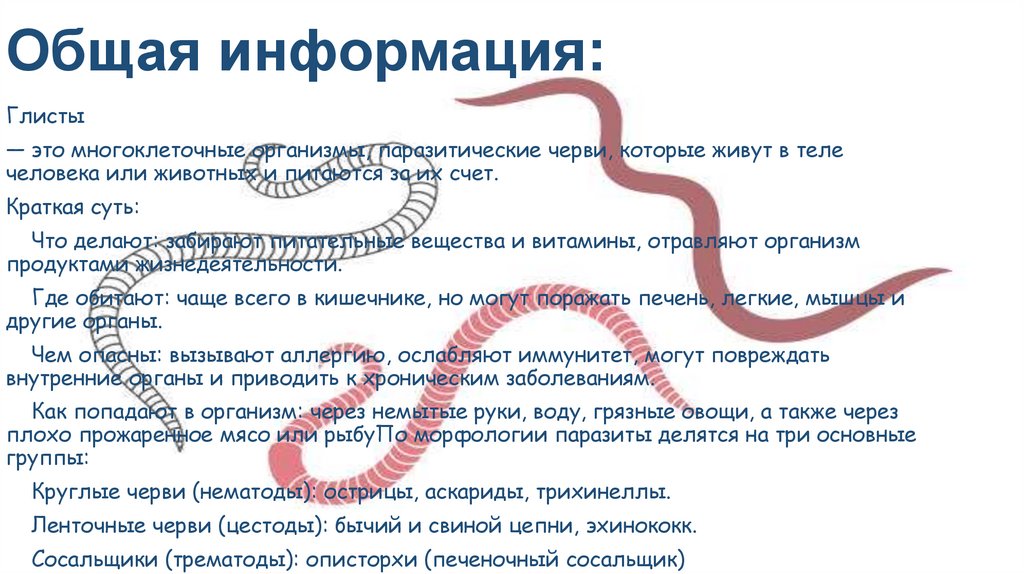 плохо прожаренное мясо или рыбуПо морфологии паразиты делятся на три основные