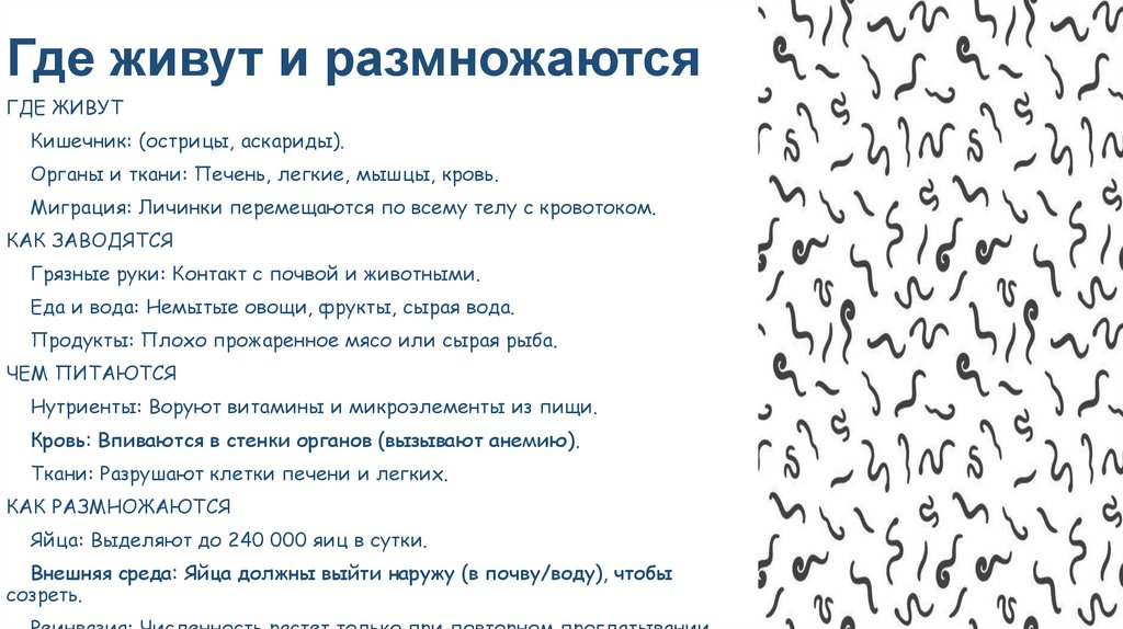 мясо/рыба и пренебрежение гигиеной рук. Большинство глистов не размножаются внутри человека «бесконечно»