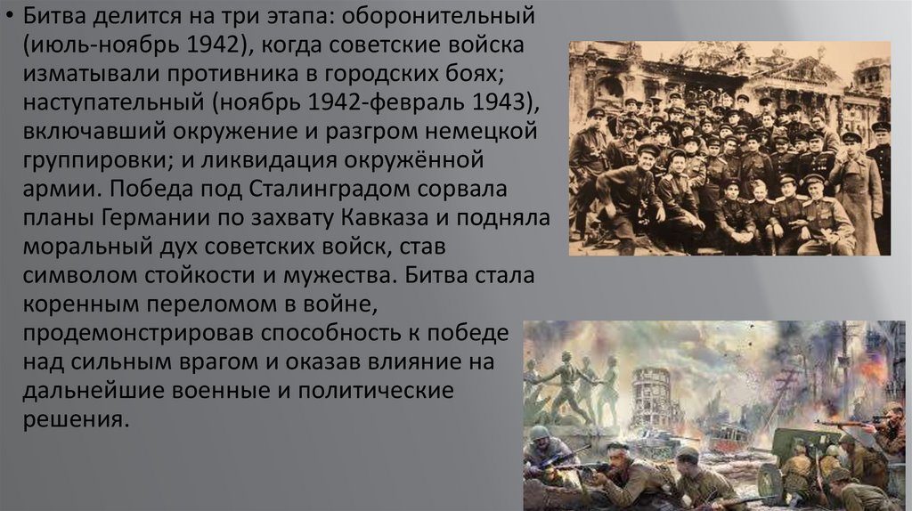 • Сталинградская битва, проходившая с августа 1942 года по февраль 1943 года, представляется