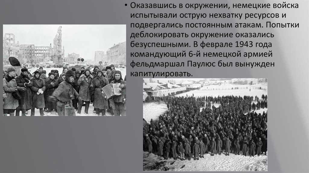 • Оказавшись в окружении, немецкие войскаиспытывали острую нехватку ресурсов и