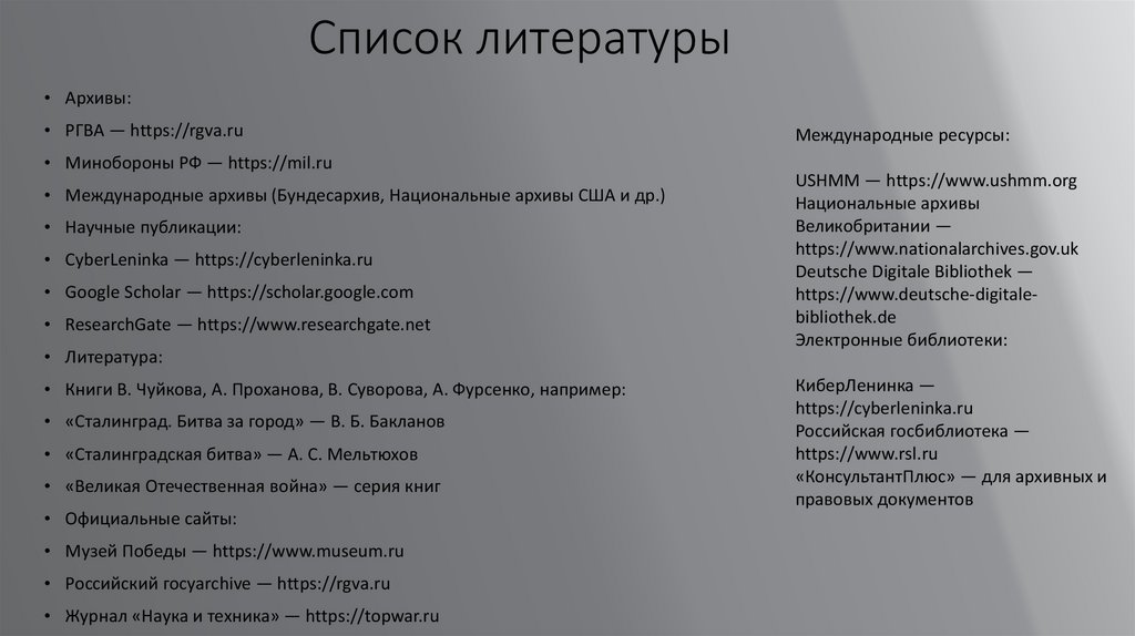 • Книги В. Чуйкова, А. Проханова, В. Суворова, А. Фурсенко, например: