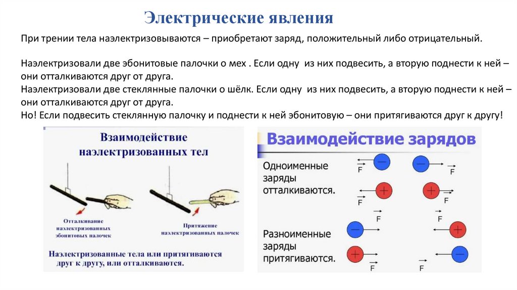 Электрические явленияПри трении тела наэлектризовываются – приобретают заряд, положительный либо отрицательный.