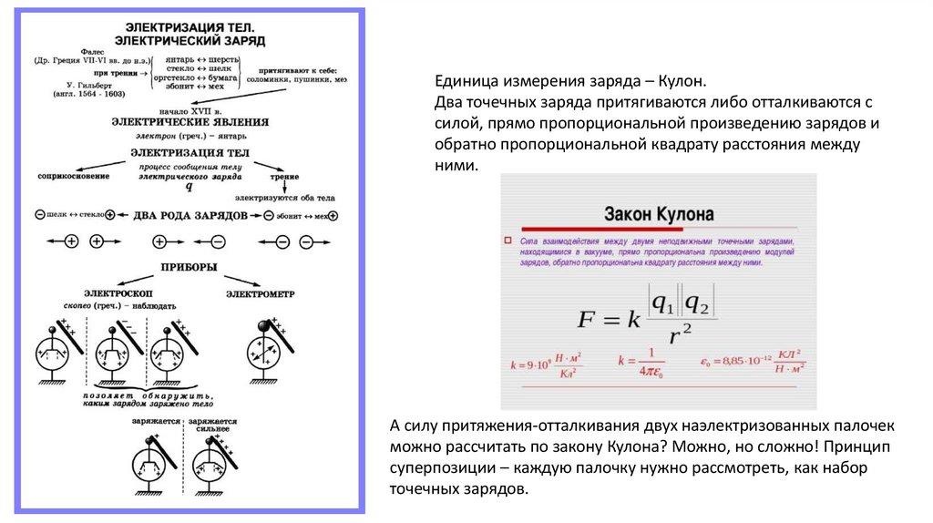 Единица измерения заряда – Кулон.Два точечных заряда притягиваются либо отталкиваются с