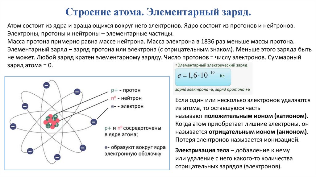 Строение атома. Элементарный заряд.Атом состоит из ядра и вращающихся вокруг него электронов. Ядро состоит из протонов и нейтронов.