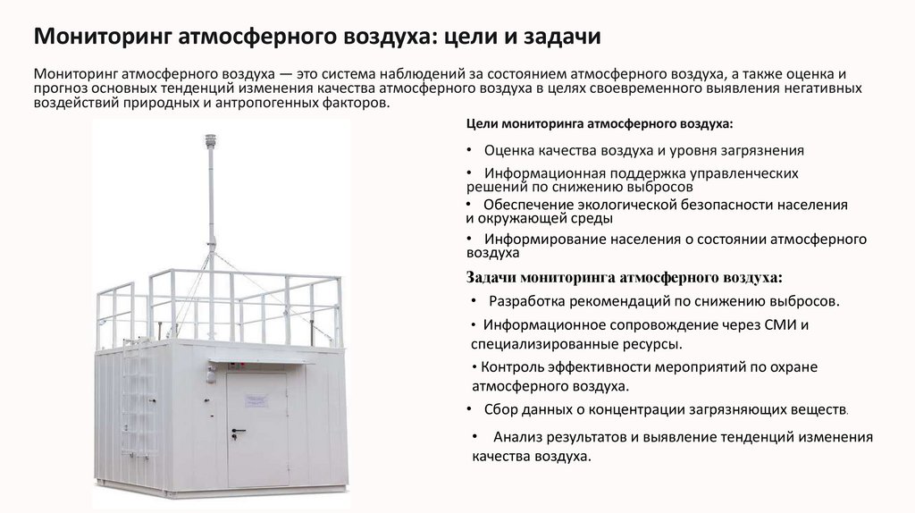 Мониторинг атмосферного воздуха: цели и задачиМониторинг атмосферного воздуха — это система наблюдений за состоянием атмосферного воздуха, а также оценка и