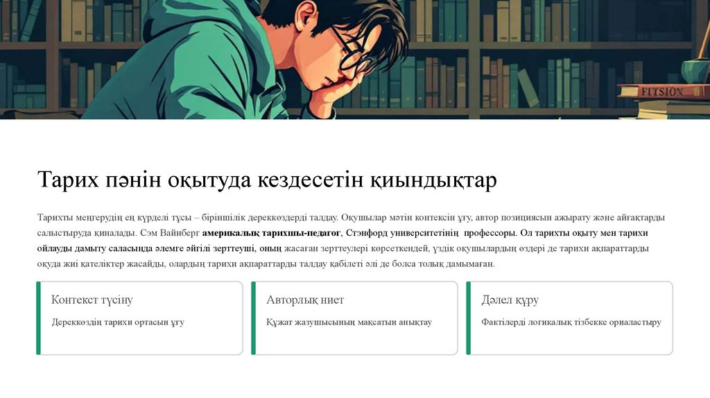 Тарих пәнін оқытуда кездесетін қиындықтарТарихты меңгерудің ең күрделі тұсы – біріншілік дереккөздерді талдау. Оқушылар мәтін контексін ұғу, автор позициясын ажырату және айғақтарды