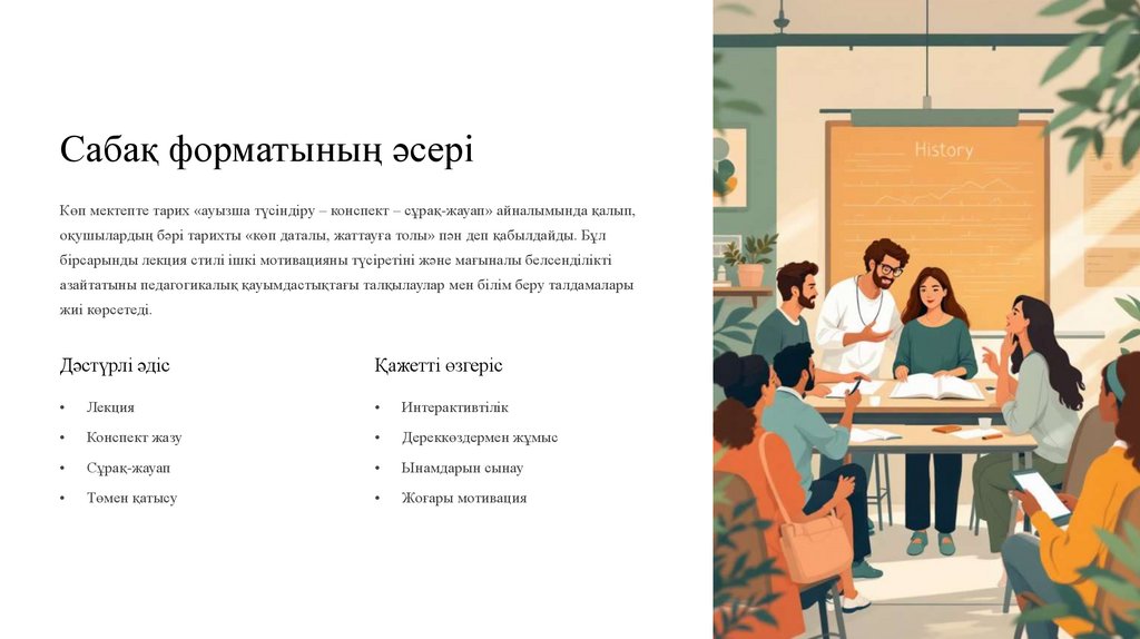 Сабақ форматының әсеріКөп мектепте тарих «ауызша түсіндіру – конспект – сұрақ-жауап» айналымында қалып,