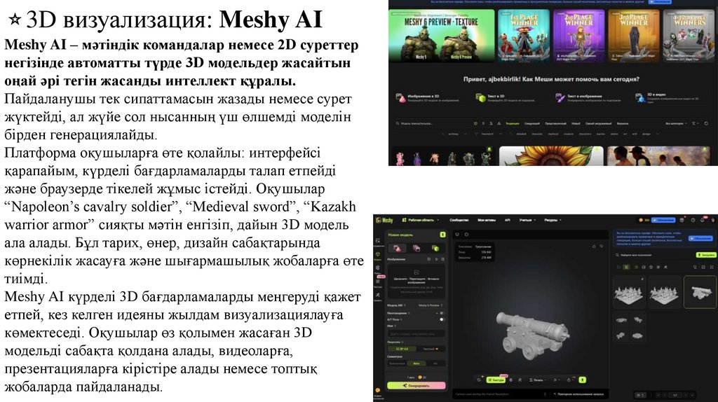 ⭐3D визуализация: Meshy AIMeshy AI – мәтіндік командалар немесе 2D суреттер