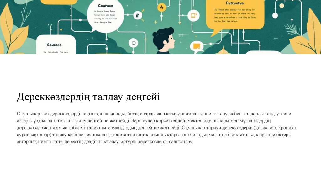 Дереккөздердің талдау деңгейіОқушылар жиі дереккөздерді «оқып қана» қалады, бірақ оларды салыстыру, авторлық ниетті тану, себеп-салдарды талдау және