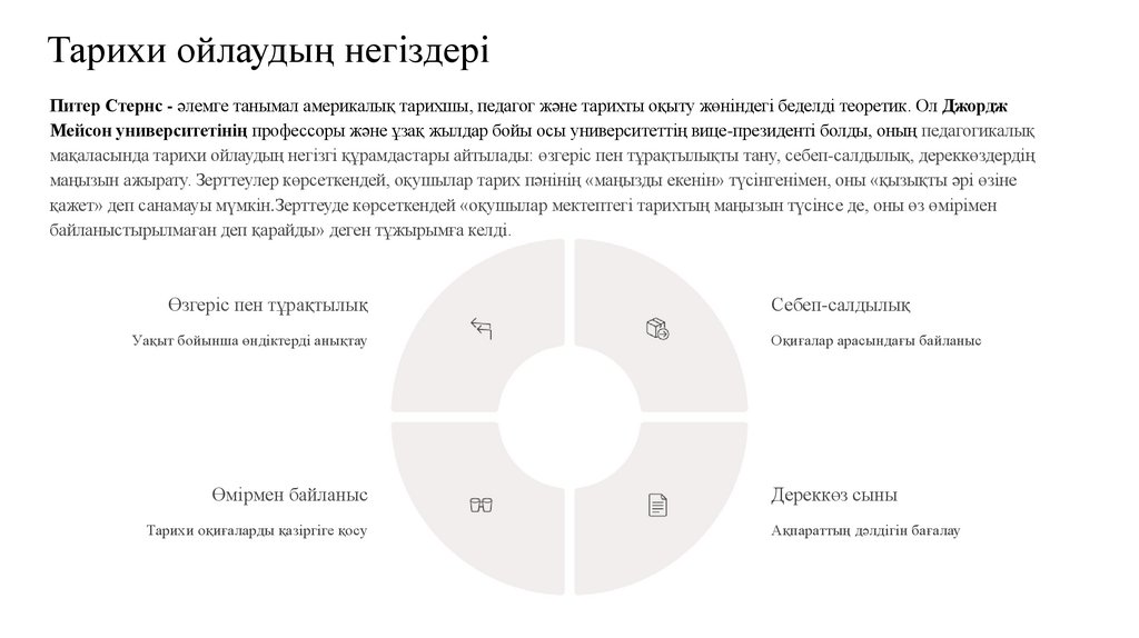 Тарихи ойлаудың негіздеріПитер Стернс - әлемге танымал америкалық тарихшы, педагог және тарихты оқыту жөніндегі беделді теоретик. Ол Джордж