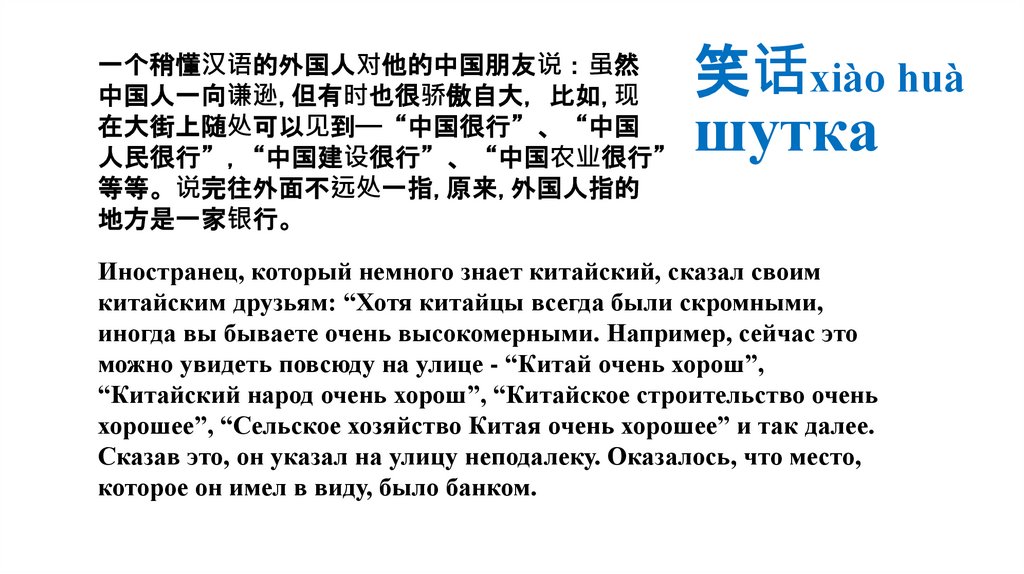 一个稍懂汉语的外国人对他的中国朋友说 虽然中国人一向谦逊,但有时也很骄傲自大 比如,现