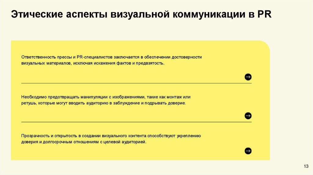 Этические аспекты визуальной коммуникации в PRОтветственность прессы и PR-специалистов заключается в обеспечении достоверности