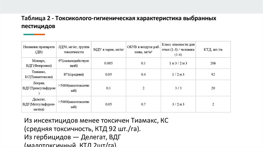 Таблица 2 - Токсиколого-гигиеническая характеристика выбранныхпестицидов