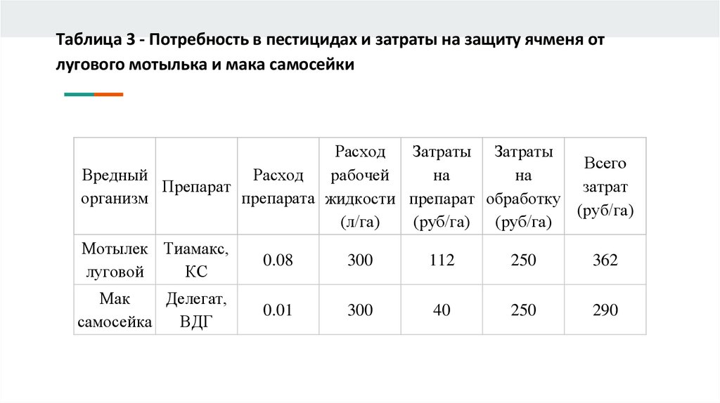Таблица 3 - Потребность в пестицидах и затраты на защиту ячменя отлугового мотылька и мака самосейки