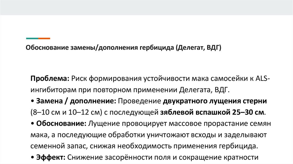 Обоснование замены/дополнения гербицида (Делегат, ВДГ)Проблема: Риск формирования устойчивости мака самосейки к ALSингибиторам при повторном применении Делегата, ВДГ.