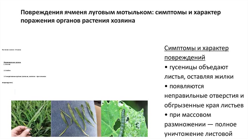 Повреждения ячменя луговым мотыльком: симптомы и характерпоражения органов растения хозяина