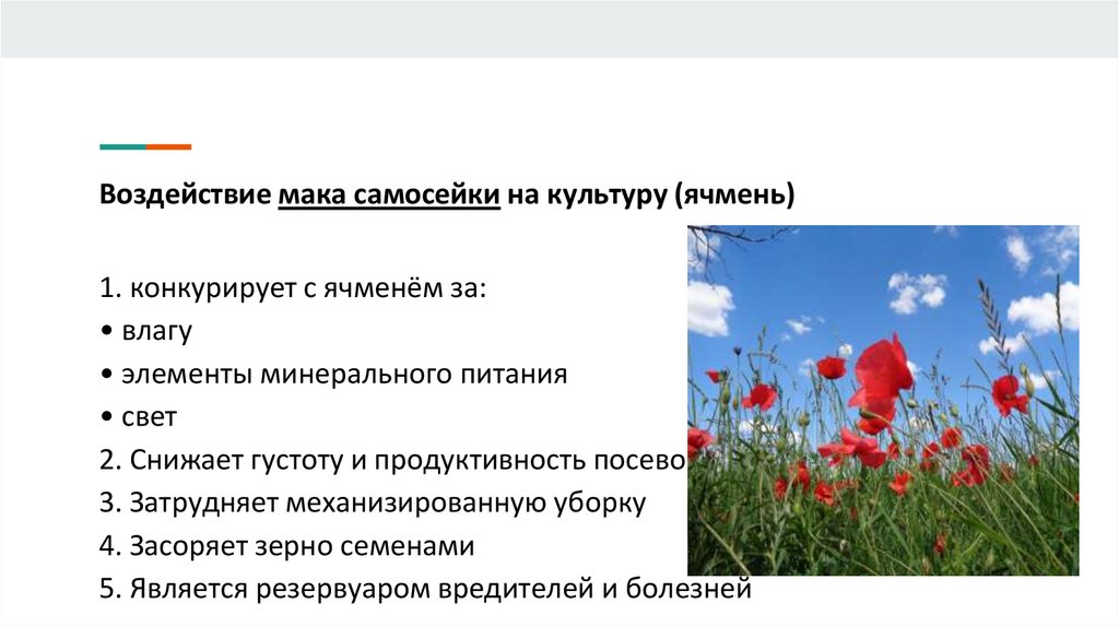 Воздействие мака самосейки на культуру (ячмень)1. конкурирует с ячменём за: