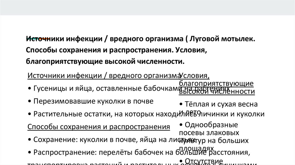 Источники инфекции / вредного организма ( Луговой мотылек.Способы сохранения и распространения. Условия,