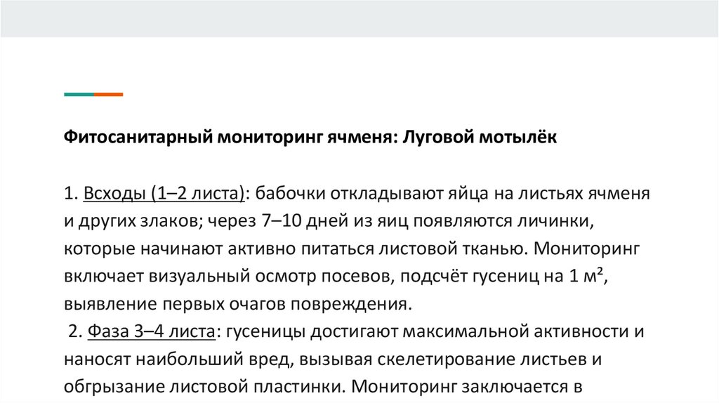 Фитосанитарный мониторинг ячменя: Луговой мотылёк1. Всходы (1–2 листа): бабочки откладывают яйца на листьях ячменя