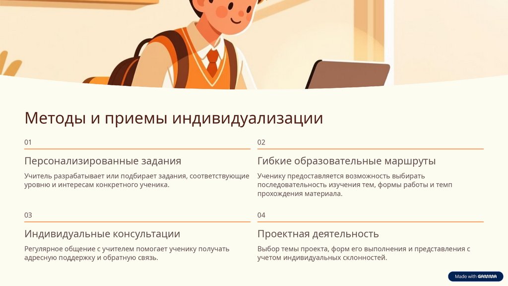 содержание, методы и темпы обучения адаптируются к индивидуальным особенностям,