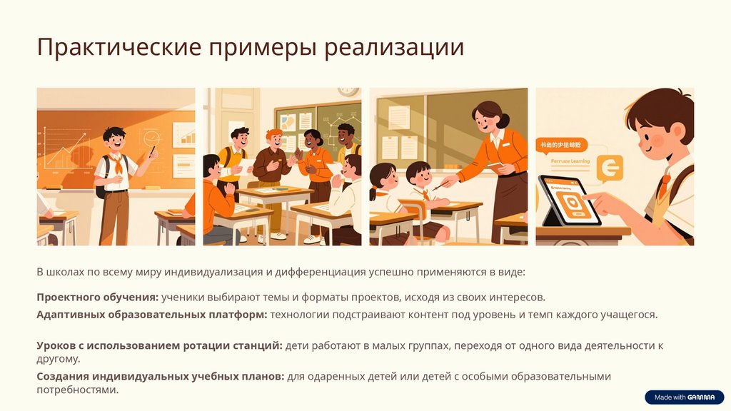 Практические примеры реализацииВ школах по всему миру индивидуализация и дифференциация успешно применяются в виде: