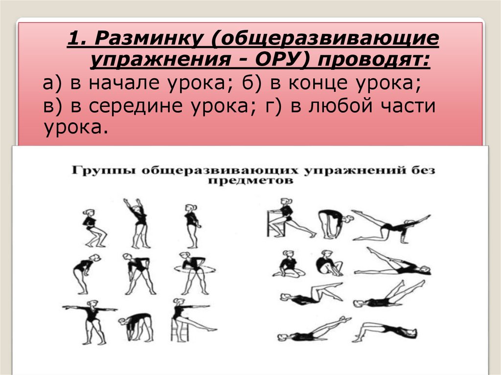 1. Разминку (общеразвивающиеупражнения - ОРУ) проводят: