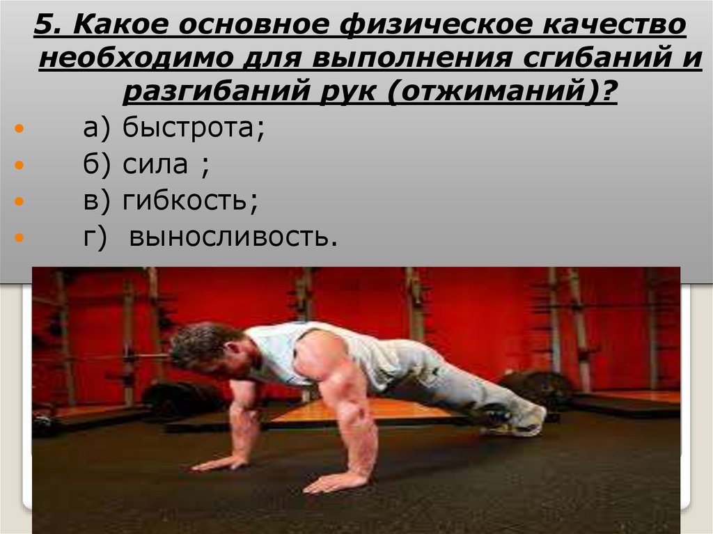 5. Какое основное физическое качествонеобходимо для выполнения сгибаний и