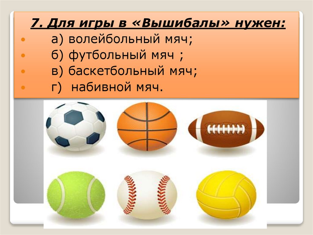 7. Для игры в «Вышибалы» нужен:а) волейбольный мяч;