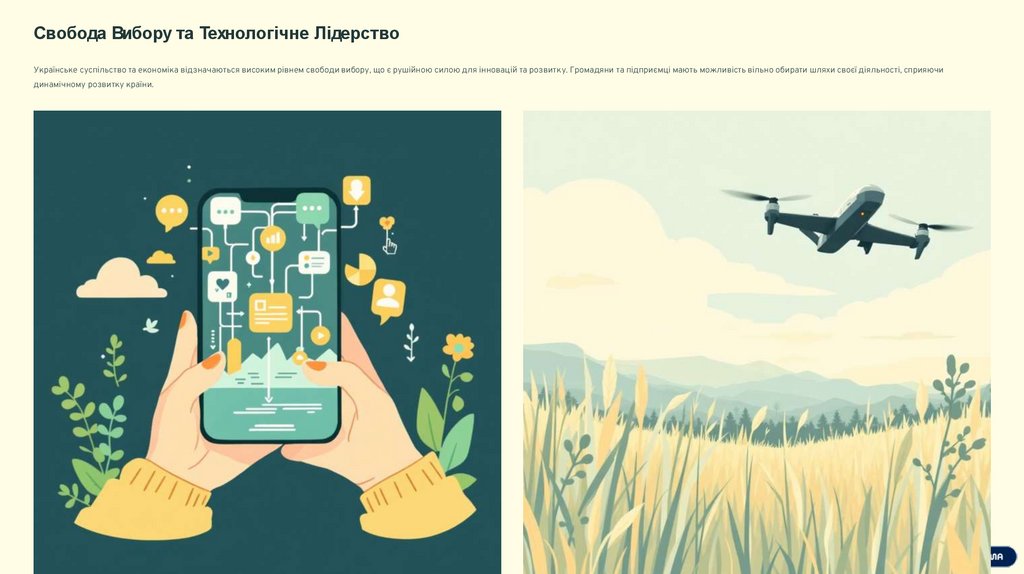 Свобода Вибору та Технологічне ЛідерствоУкраїнське суспільство та економіка відзначаються високим рівнем свободи вибору, що є рушійною силою для інновацій та розвитку. Громадяни та підприємці мають можливість вільно обирати шляхи своєї діяльності, сприяючи