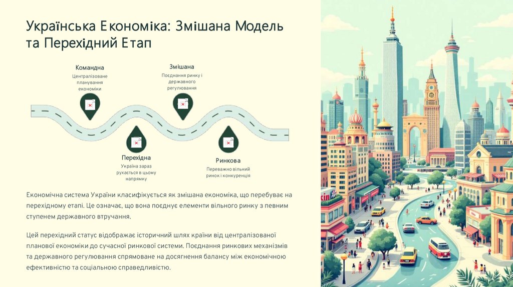 перехідному етапі. Це означає, що вона поєднує елементи вільного ринку з певним