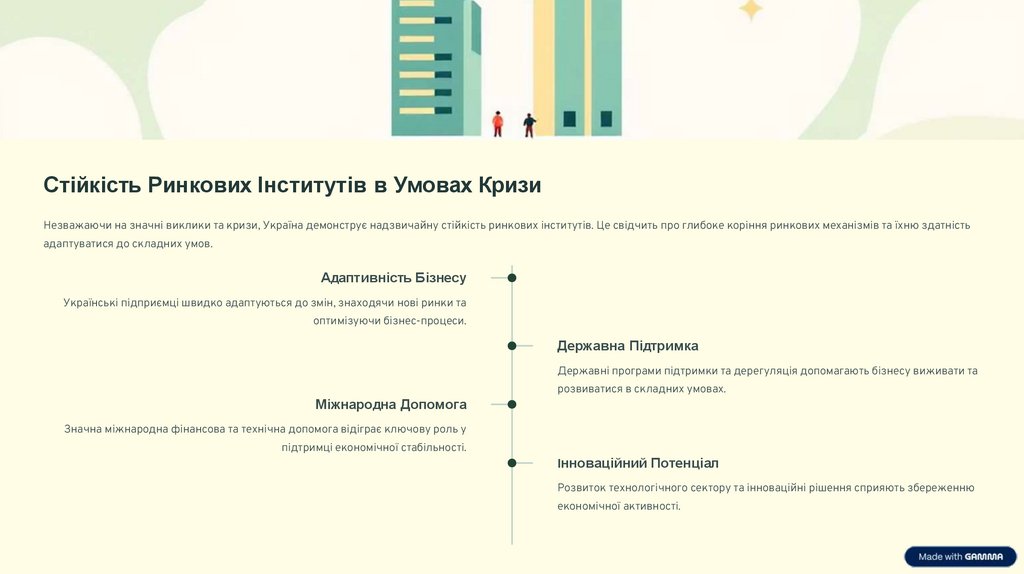 Стійкість Ринкових Інститутів в Умовах КризиНезважаючи на значні виклики та кризи, Україна демонструє надзвичайну стійкість ринкових інститутів. Це свідчить про глибоке коріння ринкових механізмів та їхню здатність
